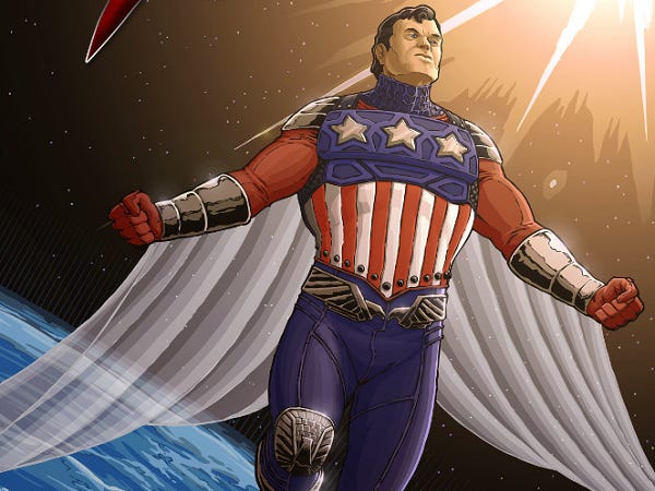 [American Eagle is] a firefighter whose superpowers manifest while he’s rescuing children from a burning school. He’s a married Christian father of two who coaches Little League, and when his powers develop, he goes and loyally serves the U.S. Government.